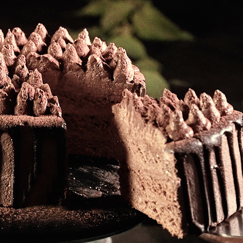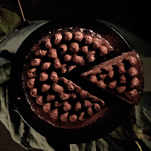 Šokolādes trifeļu tortes garša ir ļoti bagātīga, jo kakao - olu biskvīta kārtas mijas šokolādes trifeļu krēma kārtām.